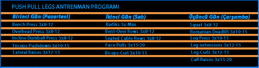 Push Pull Legs, kas gruplarını bölerek antrenman yapmayı amaçlayan bir sistemdir. Itme (push), çekme (pull) ve bacak (legs) günleri şeklinde bölünerek uygulanır.