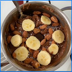 Pirinç ununu soğuk sütle orta ateşte karıştırarak kıvam aldığında üzerine bitter çikolata, fıstık ezmesi ve fındıkları ekleyip soğuduğunda tüketiyorum.